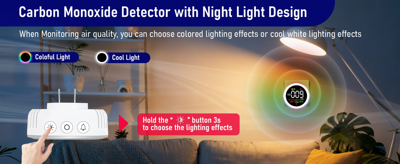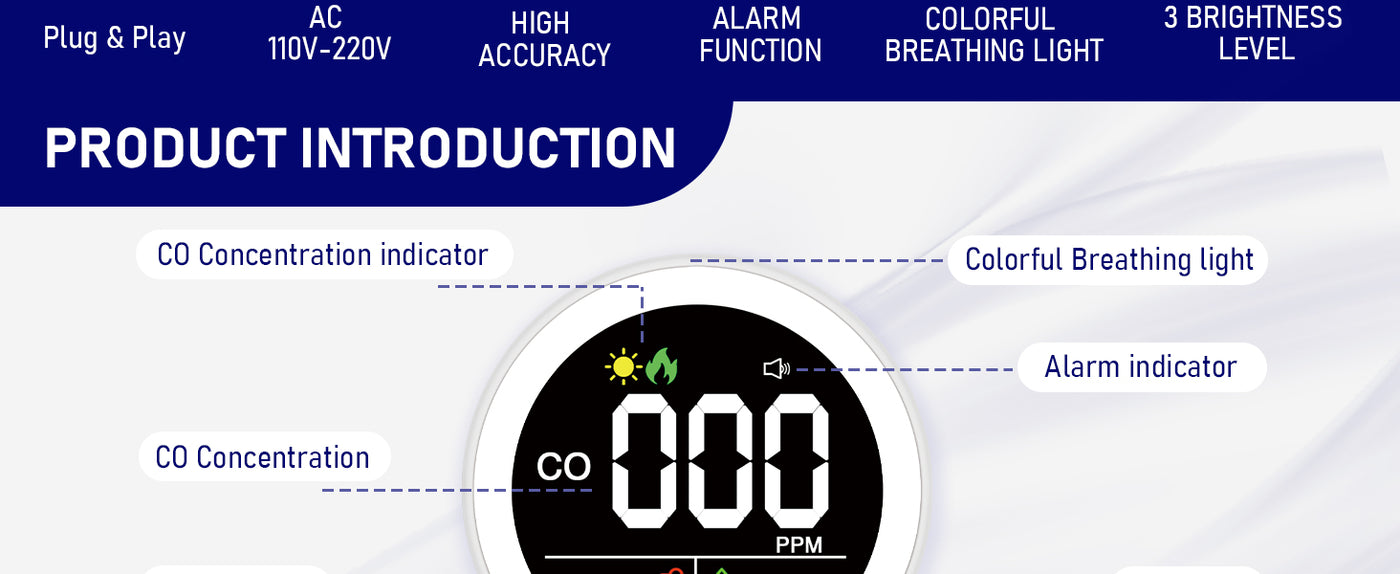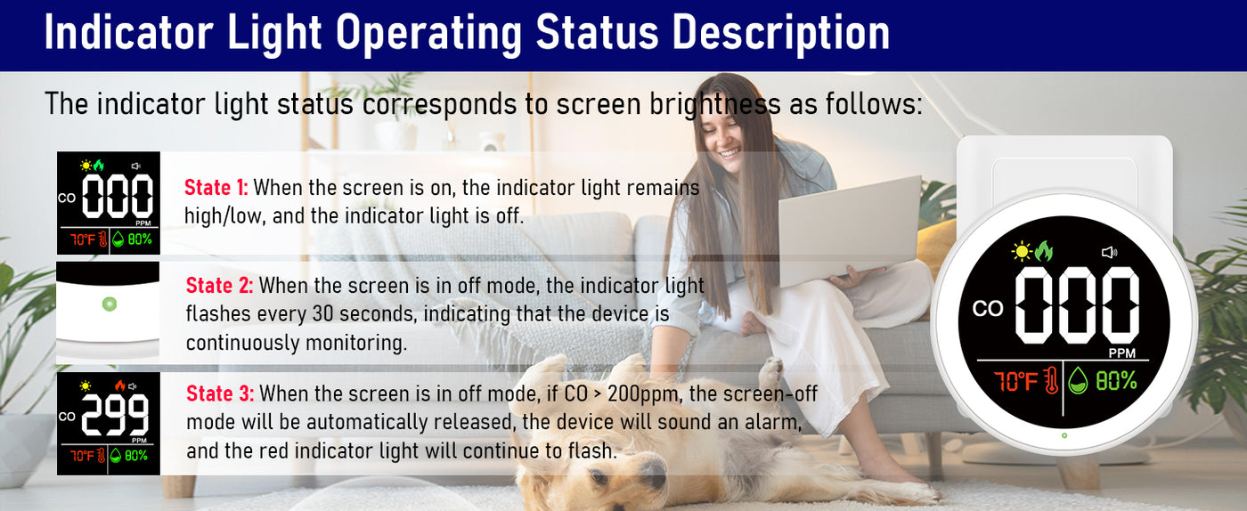 • Thoughtful Brightness Design: You can choose high, medium and off screen brightness settings. The breathing light can also be turned off. Please rest assured that even when the breathing light or screen brightness is turned off, the product continues to detect the CO concentration value in the surrounding environment.