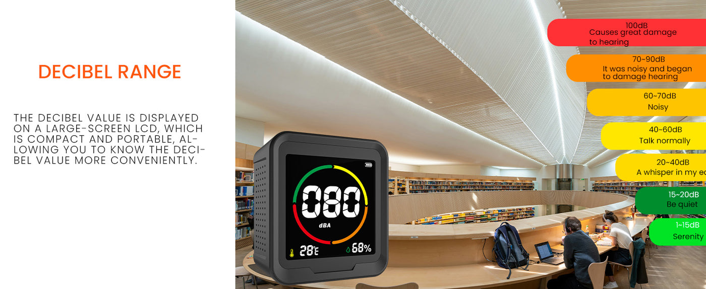 • High-precision Decibel Detector: This sound level meter uses an intelligent air semiconductor sensor to test decibel temperature and humidity values, which is more sensitive, accurate and stable than ordinary sensors.
