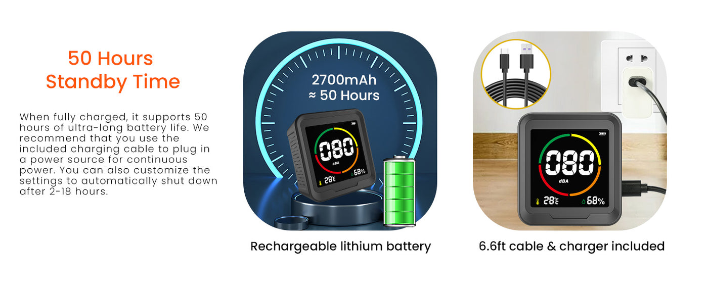 • Portable Decibel Meter: The decibel meter is powered by a built-in 2700mAh lithium-ion battery, equipped with a 6.5ft USB charging cable, and the charging port is also included in the package. You can operate it anytime, anywhere. The battery life is 50 hours.