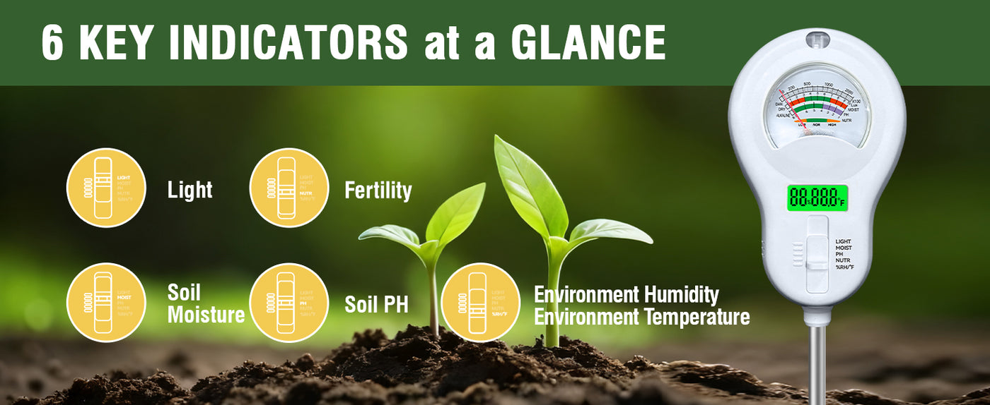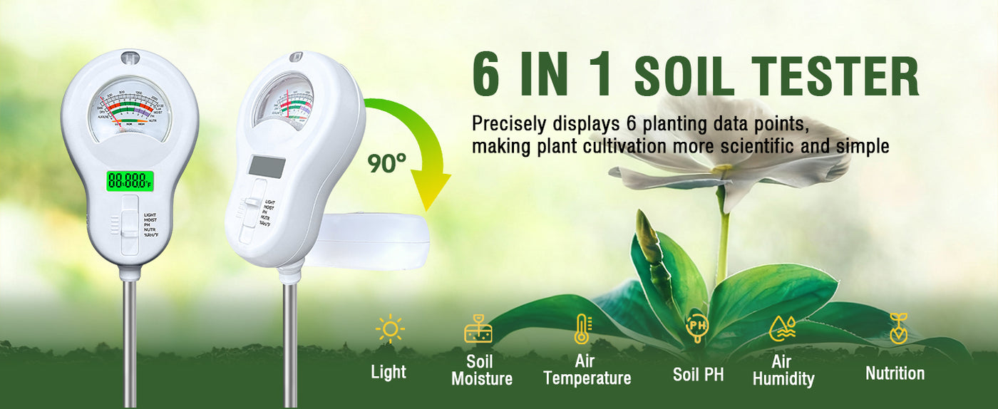 - 【6-in-1 Soil Tester】This 6-in-1 soil tester can detect light intensity, soil moisture, soil fertility, ambient temperature, soil pH, and ambient humidity, ensuring plants are in optimal growth condition and making planting more scientific and precise. After use, please note: Do not wash the probe with water; wipe it with a cloth or paper towel to keep it clean.