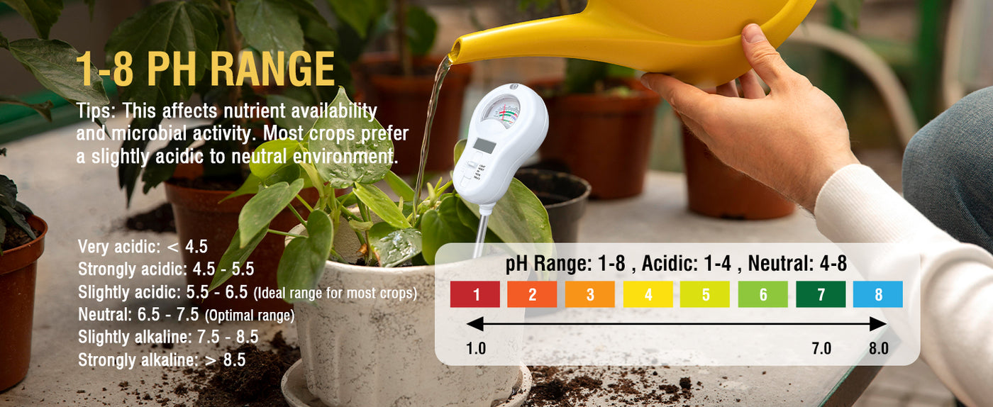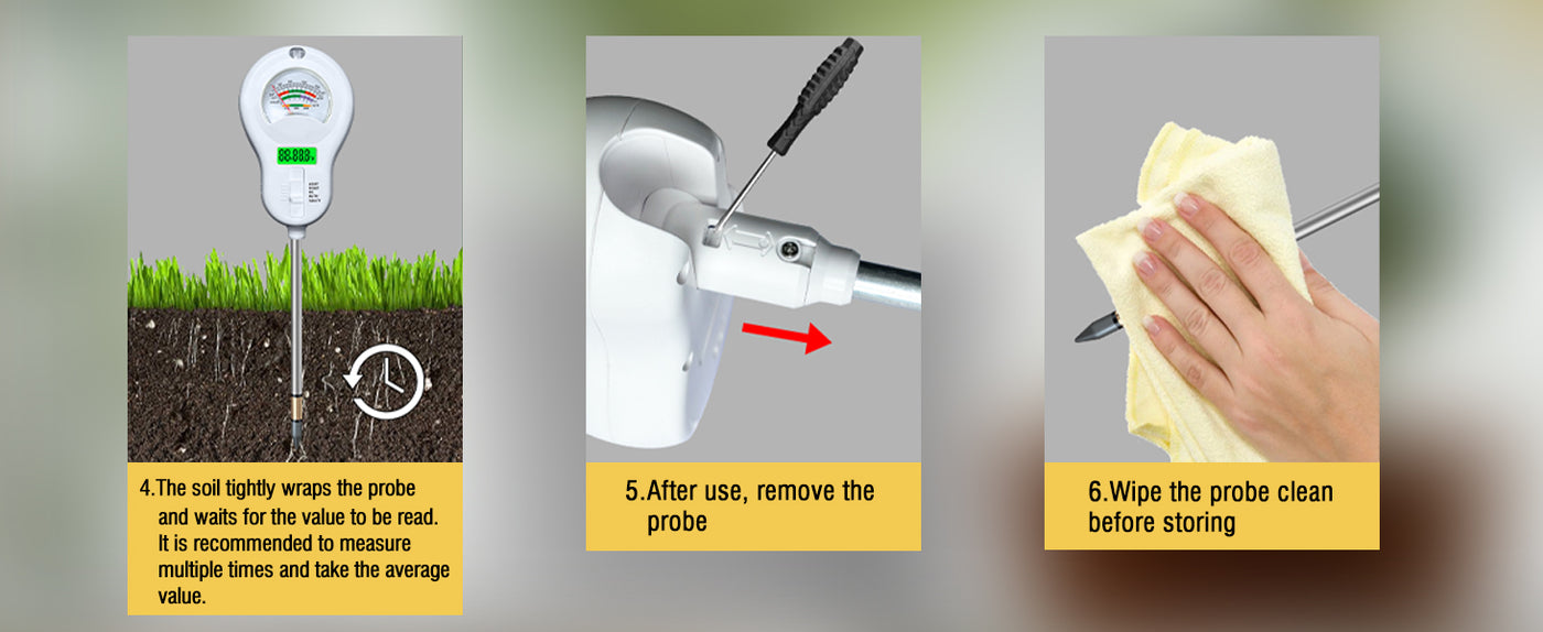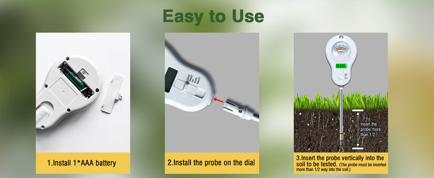 - 【Easy-to-use soil tester】Simply insert the probe vertically into the soil to a depth of approximately 2/3. Do not shake it, and ensure full contact between the probe and the soil. Wait 5-10 seconds for it to stabilize before acquiring the measurement data.