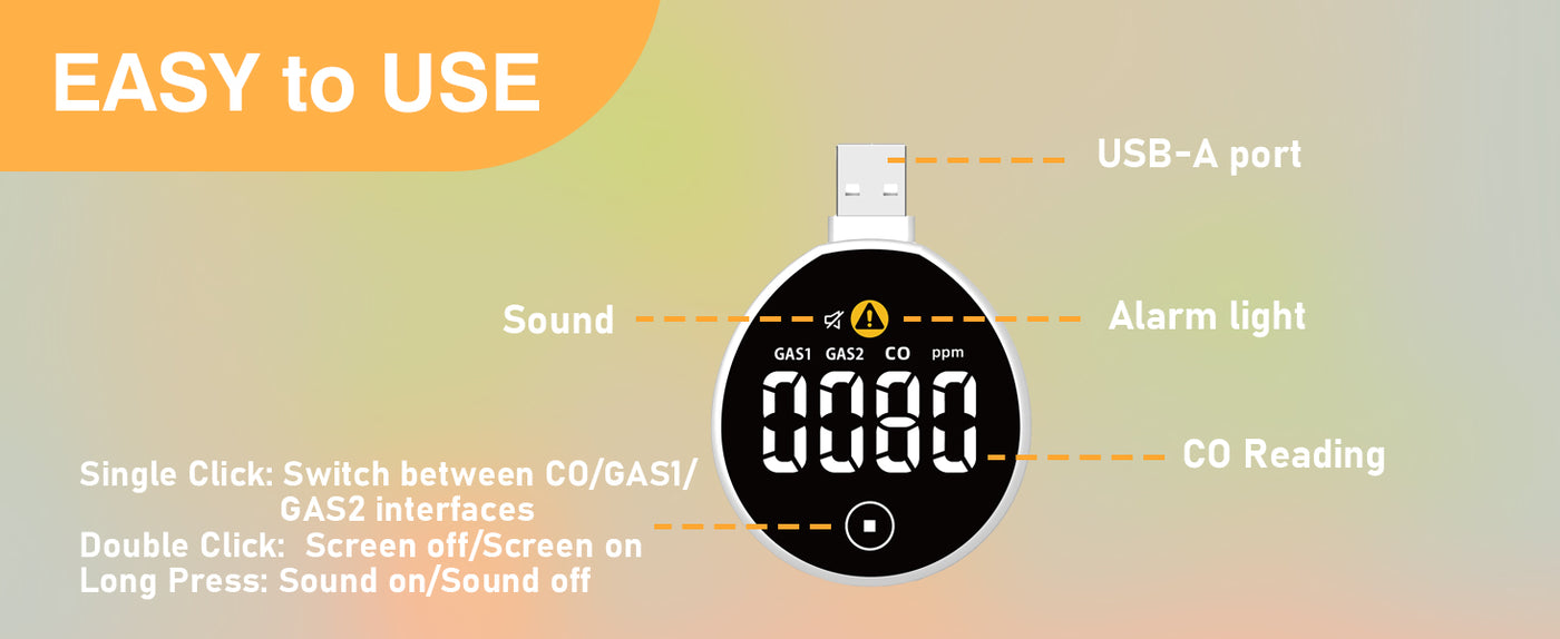 - USB CO and Combustible Detector: Compared with plug-in carbon monoxide and combustible detectors, this portable carbon monoxide and combustible detector is compact (size: 2.1x2.8 inches) and easy to carry.