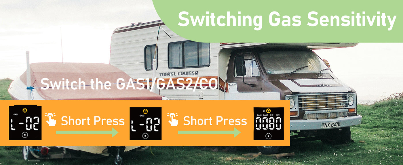 - Carbon Monoxide & Propane Gas Alarm range: When 0%<GAS1/GAS2<5%LEL, the value is L-01, indicating that the GAS value is normal, no icon is displayed, and there is no sound alarm; when 5%≤GAS1/GAS2<8%, the value is L-02, the orange light flashes slowly, indicating a warning (in the initial default state, there is a sound alarm); When GAS1/GAS2 is greater than or equal to 8% LEL, the value is L-03, the red light flashes quickly, indicating danger.
